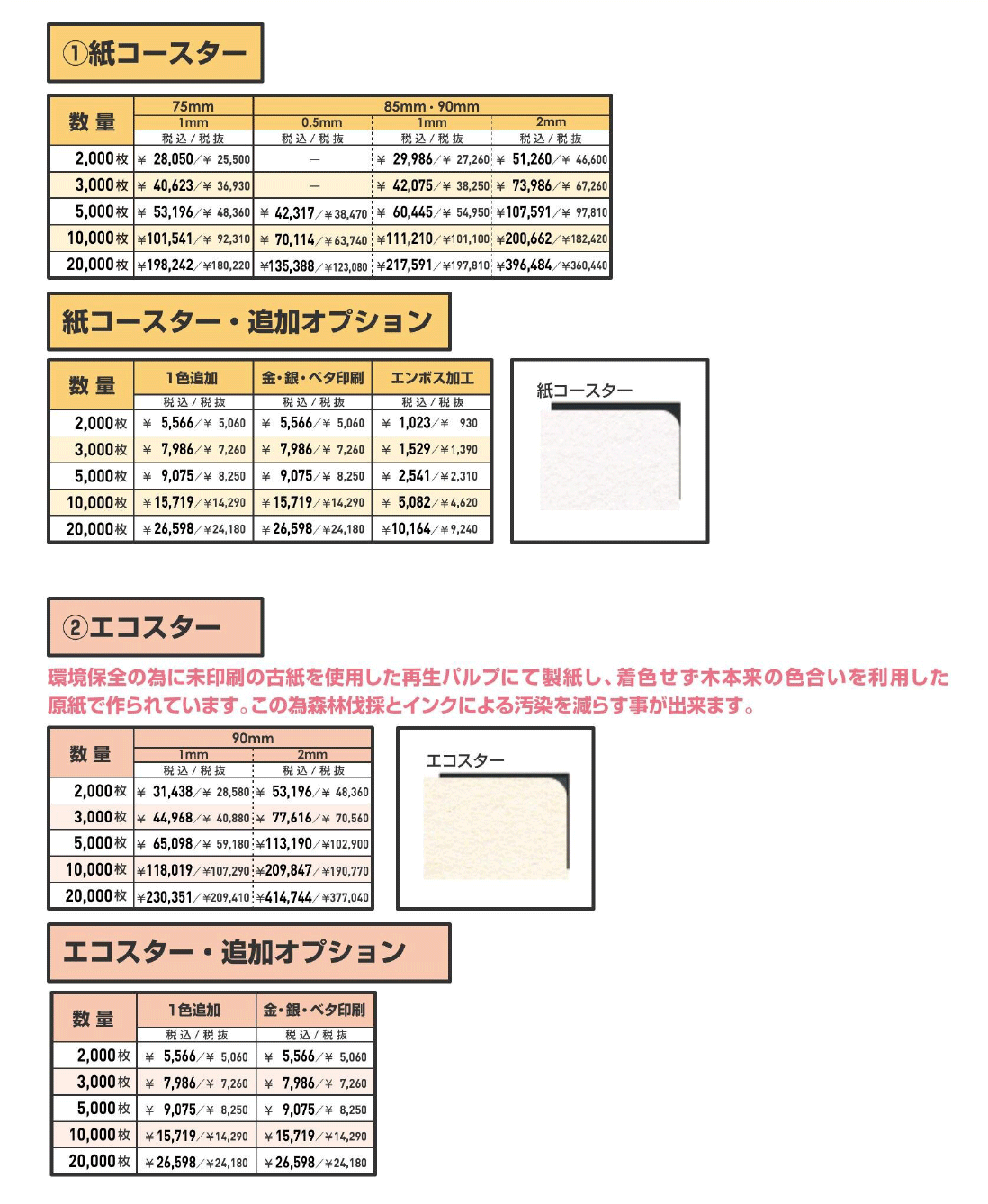 名入れコースター販売価格一覧(初回データー作成料¥1,650~、初回型作成代¥5,885~)